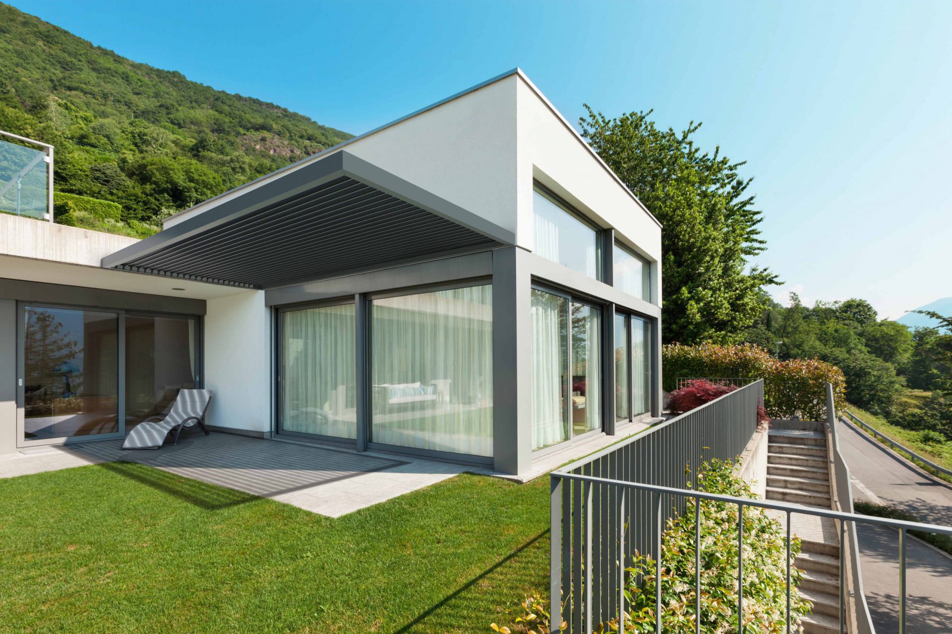 Bei Sonnenschein sorgen die leicht geöffneten Aluminiumlamellen für Beschattung und lassen zugleich die Luft zirkulieren. Vollständig geschlossen, bieten sie zuverlässigen Schutz vor Regen und Nässe.